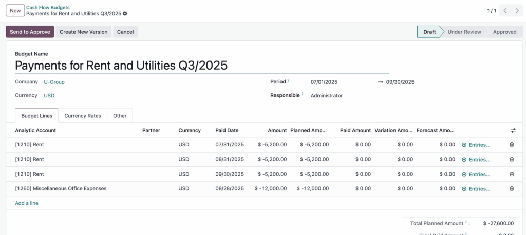 - Multi-currency support: Budgets may include lines in different currencies. Exchange rates are stored in the document; Odoo recalculates totals automatically.
