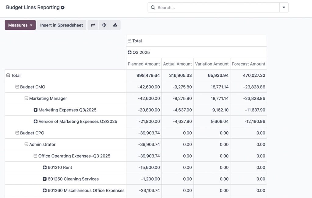 - Analytics: Pivot views show planned vs actual vs variation. You can group by owner, period, cost center, department, partner, or analytic account. Forecasts help calculate remaining obligations for the year.