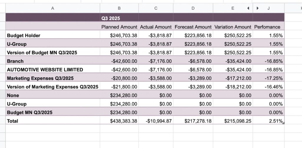 - Document structure: Each budget has a name, period, currency, department, cost center, and owner. Budgets can be grouped, filtered, and searched easily.